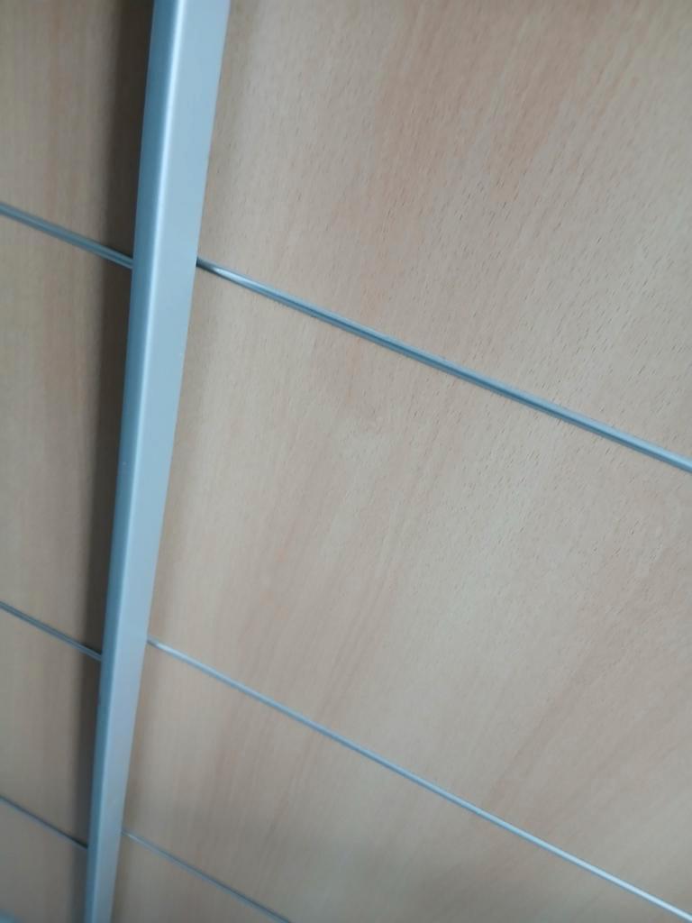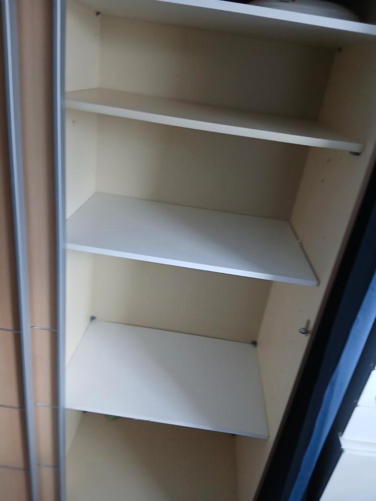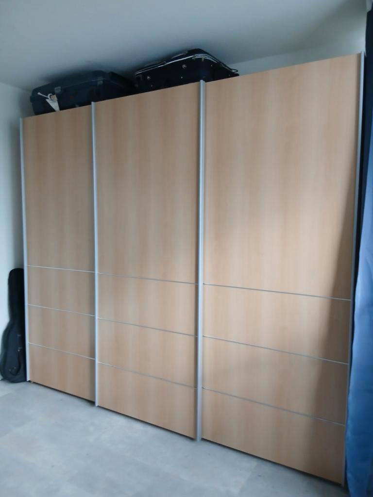 Van goede kwaliteit ruime kledingkast met schuifdeuren planken en stang. De binnenkant is wat verkleurd zie foto''s, af te hale