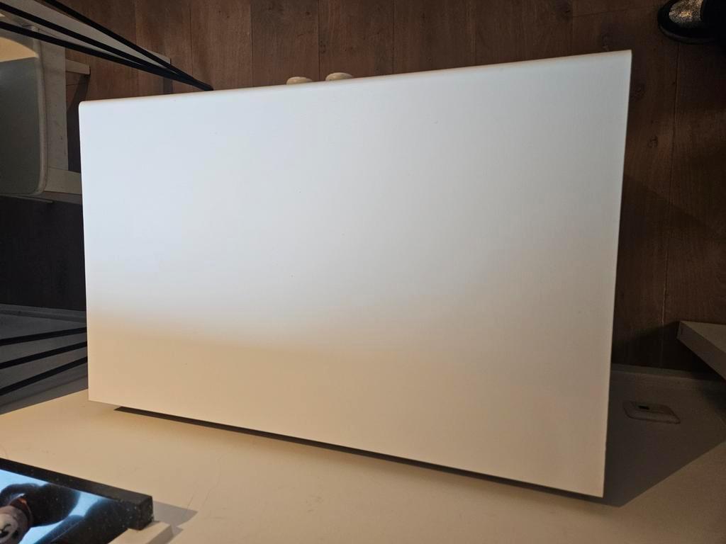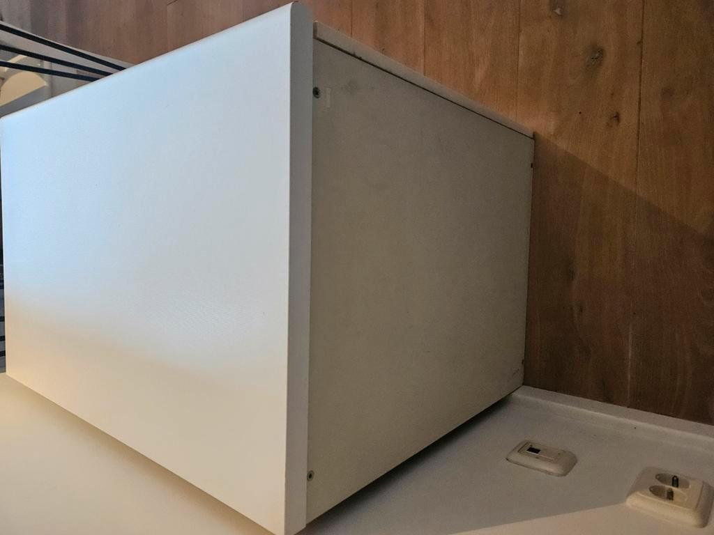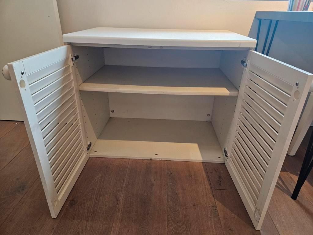 Wit kastje met witte deurtjes. Afmetingen: 80,5 cm breed 50,5 cm diep 65 cm hoog