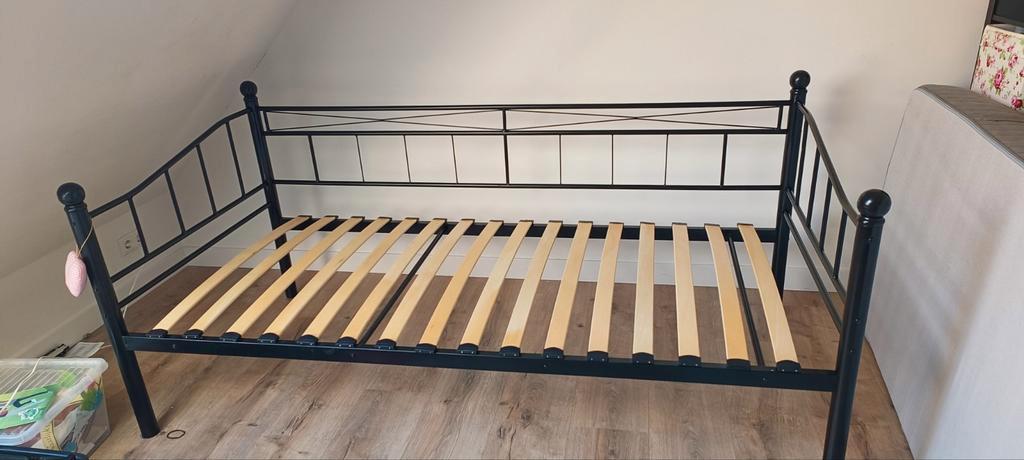 Een leuk en stevig zwart metalen eenpersoonsbed met lattenbodem. Matras niet inbegrepen. Zelf uit elkaar halen
