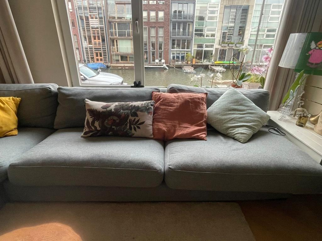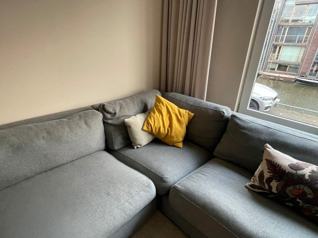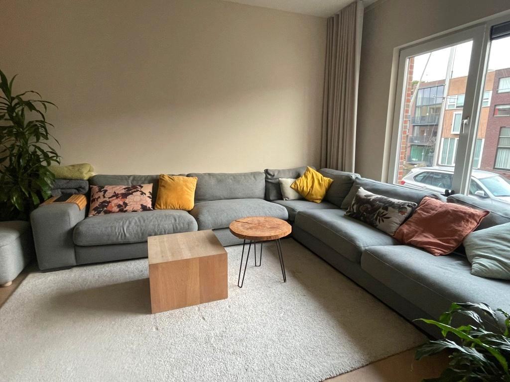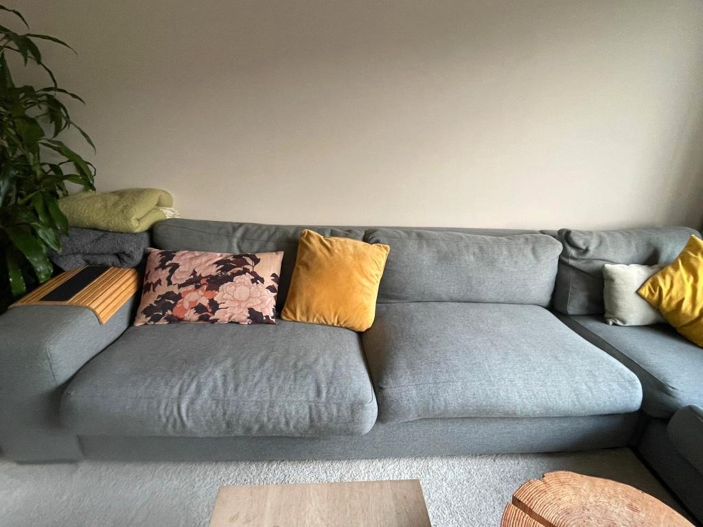 Hoekbank 300 x 320cm van grijs stof. De bank bestaat uit 3 delen: - 1 recht deel van 200cm lang x 100 cm diep - 1 recht deel van 2