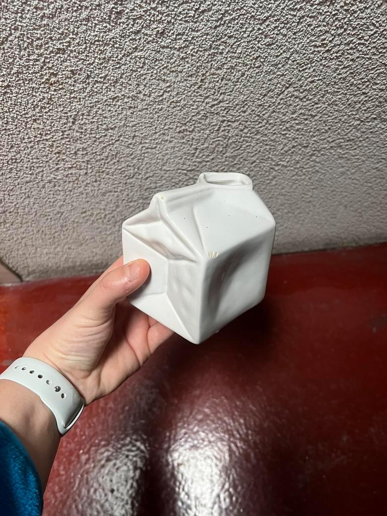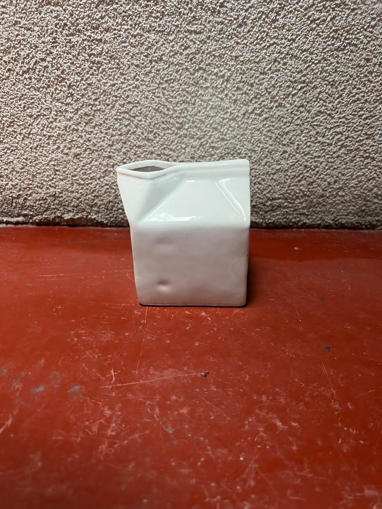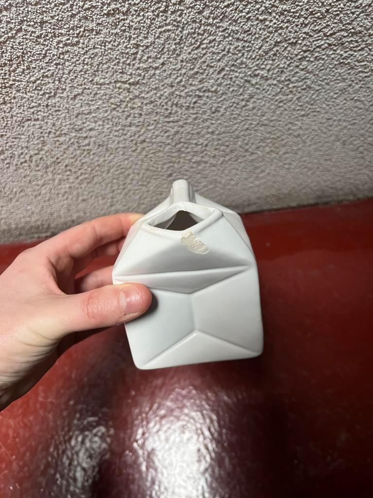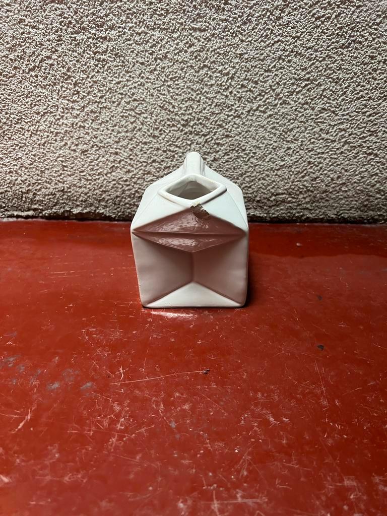 Wit vaasje in de vorm van een melkpak. Kleine beschadigingen (zie foto’s)
