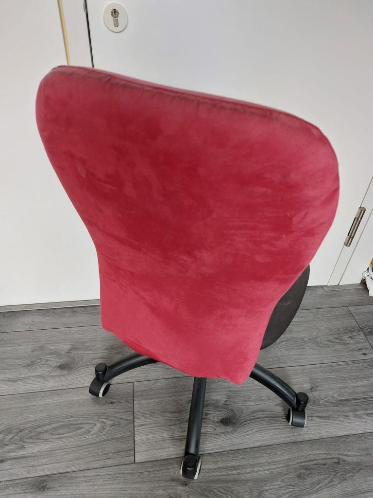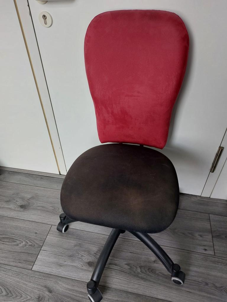 Rode bureaustoel. Hij is in hoogte verstelbaar. Gratis op te halen. Ondanks dat hij nog prima zit, is het duidelijk verkleurd dus