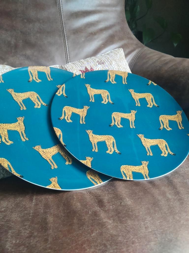 Leuk kerstcadeau! Twee grote cheetah borden (serveerschalen) van fabienne chapot. De doorsnede is ongeveer 31,5cm. Zoals je ziet z
