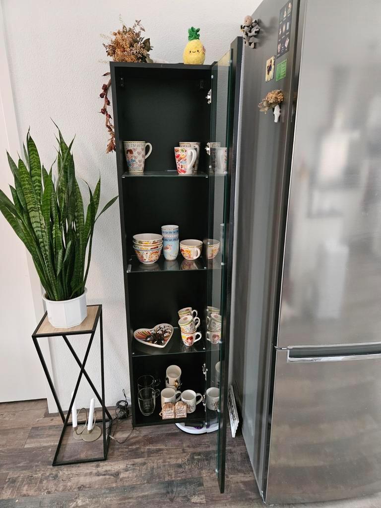 Nette hangkast met glazen platen aan de binnenkant. Kast is ook voorzien van verlichting maar de stekker is kapot dus werkt niet h