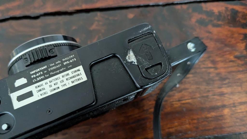 Konica c35 camera. Zoals te zien op de tweede foto is de batterij uitgelopen. Misschien kan iemand dit nog fixen. De camera is gra