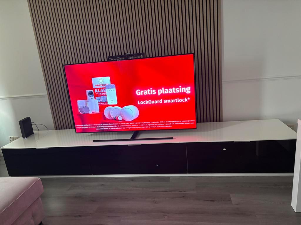 Hierbij bied ik mijn ruime en moderne tv-kast aan. De kast heeft een strak design met een witte bovenkant en zwarte laden, waardoo