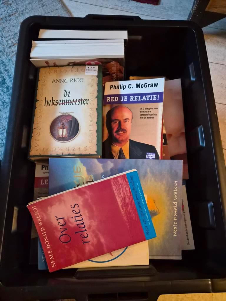 Krat vol met diverse boeken. Verschillende genres en auteurs. De boeken zijn in gelezen staat, het ene boek zo goed als nieuw en h