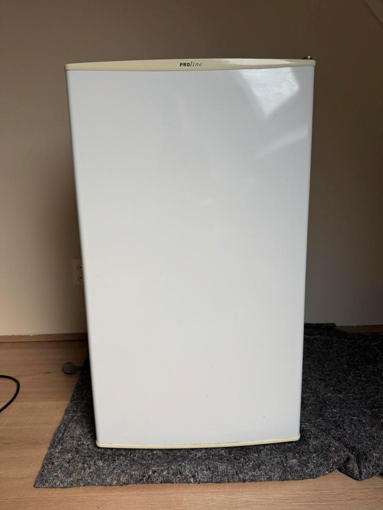 Proline koelkast met vriesvak, gebruikt maar kan prima nog een ronde mee. 83X47x49 cm een hoekje van het vriesvak klepje is afgebr