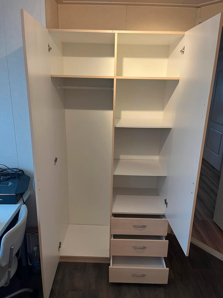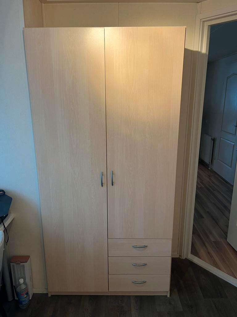 Deze kledingkast biedt veel opbergruimte met zowel hang- als legmogelijkheden. De kast is in goede staat en heeft een neutrale uit