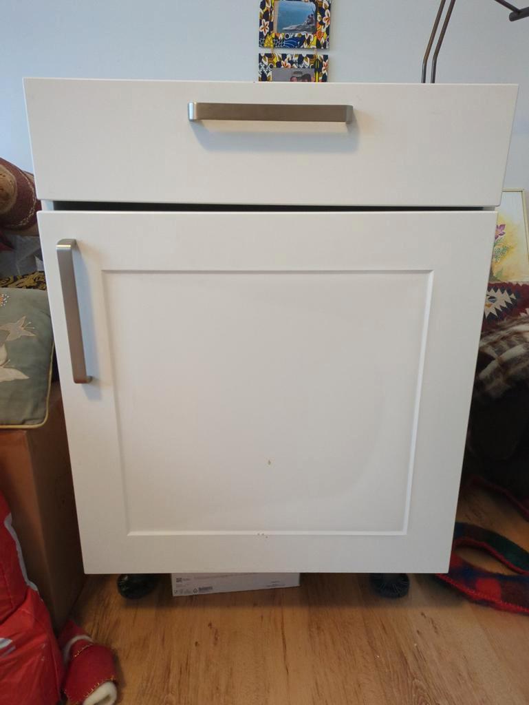 Witte keukenkast, geschikt voor plaatsing onder het aanrecht. De kast is 60 cm breed en 86 cm hoog, maar de hoogte kan eventueel a