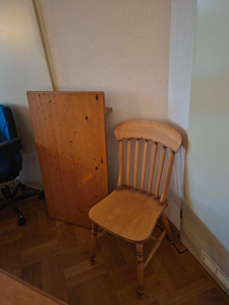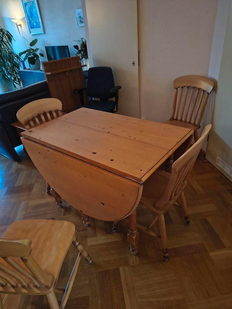 De tafel met stoelen is gratis af te halen. De tafel kan klein gemaakt worden door de zijkanten in te klappen. De tafel is uitschu