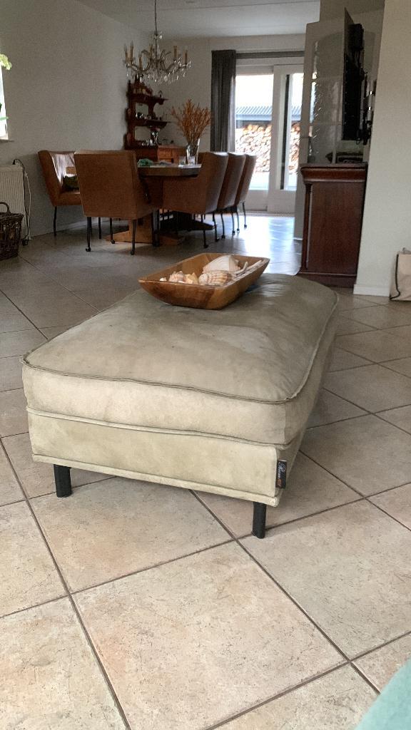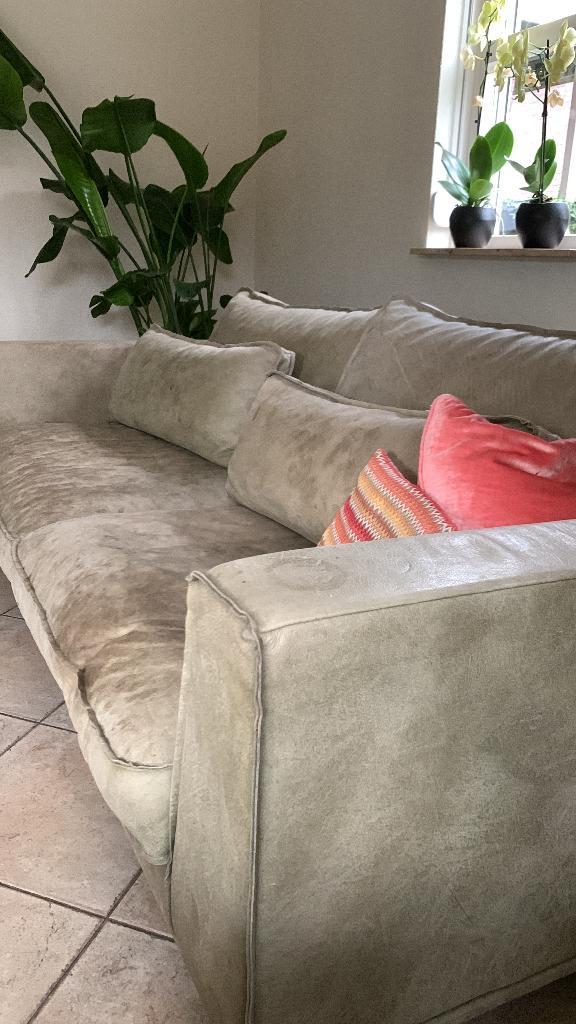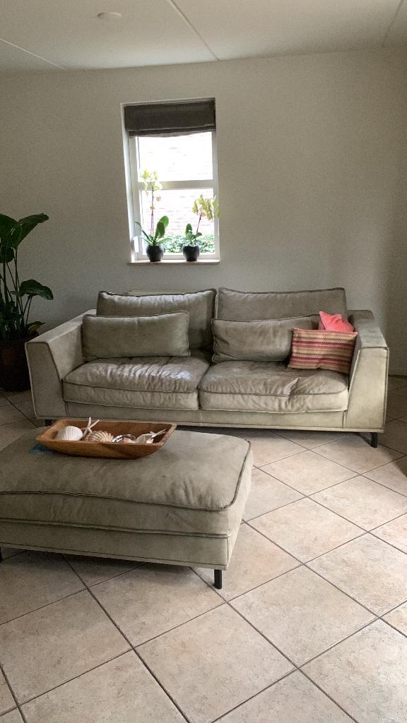 Leder bankstel breed 2:23. Diep 1.10 Hoog 0,70 kleur groen echt leer wel wat verkleuringen en wat vlekjes. Mag gratis weg hocker 0