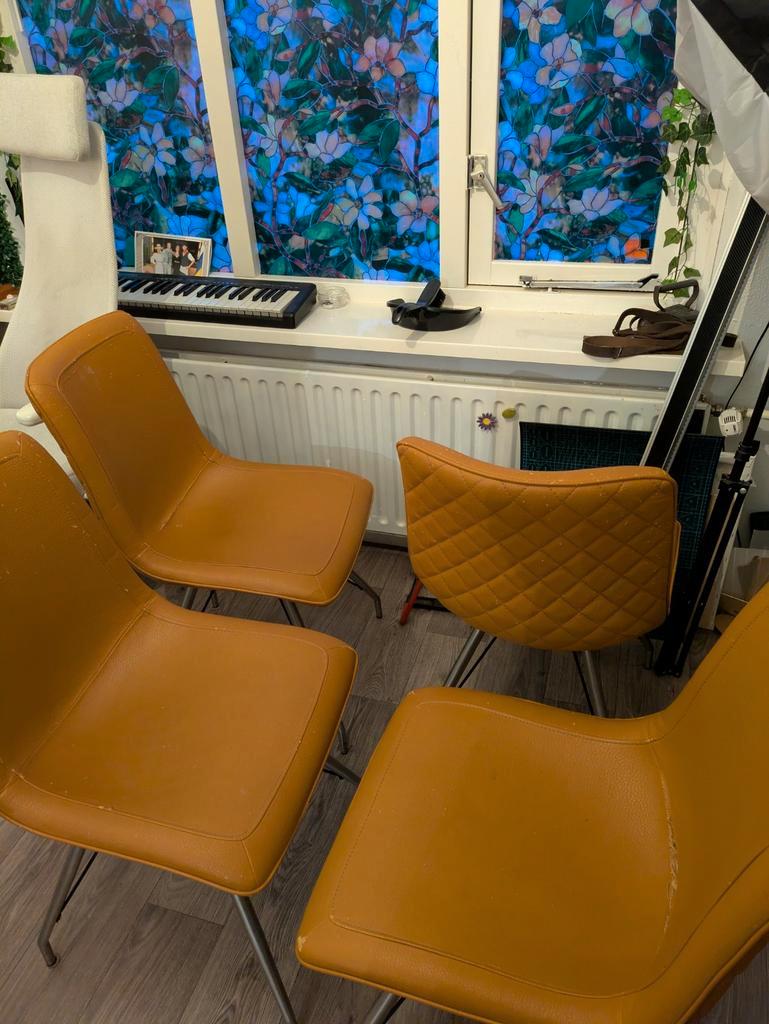 Gratis af te halen: set van 4 leuke oranje stoelen met beschadigingen.