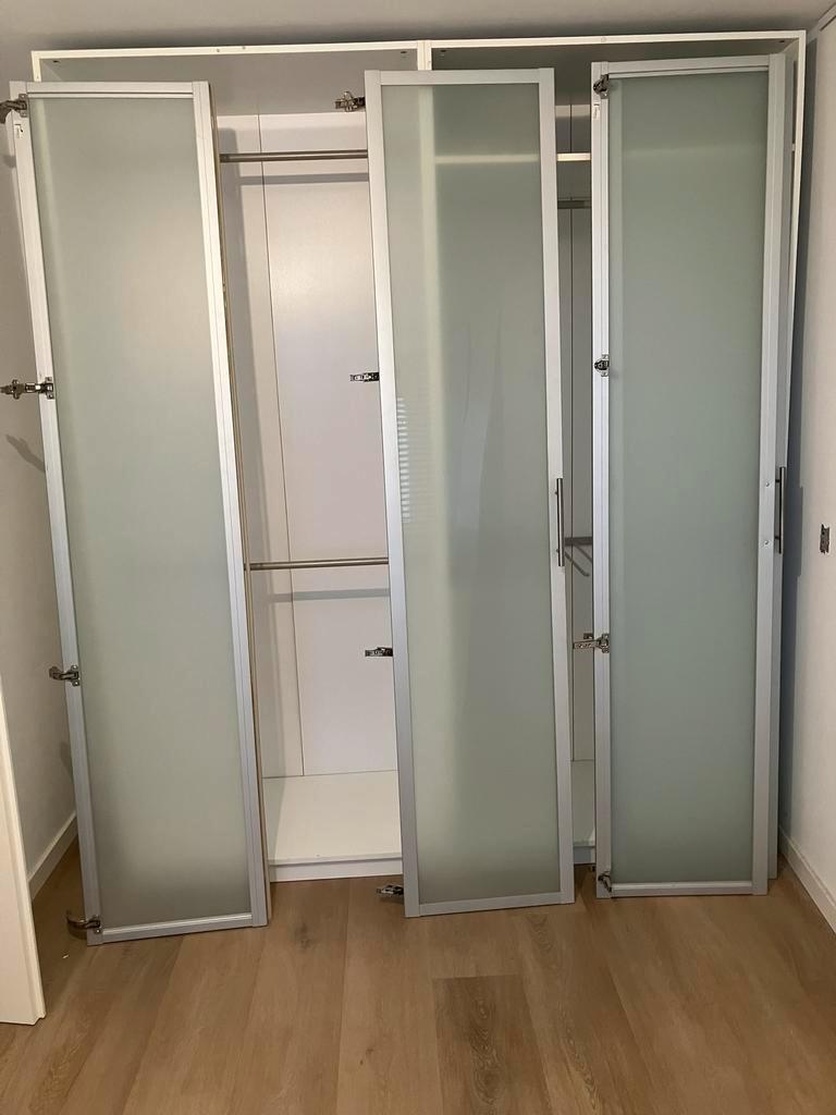 Gratis op te halen 3 melkglazen kastdeuren. De randen zijn van grijs aluminium en voorzien van de scharnieren en schroeven voor be