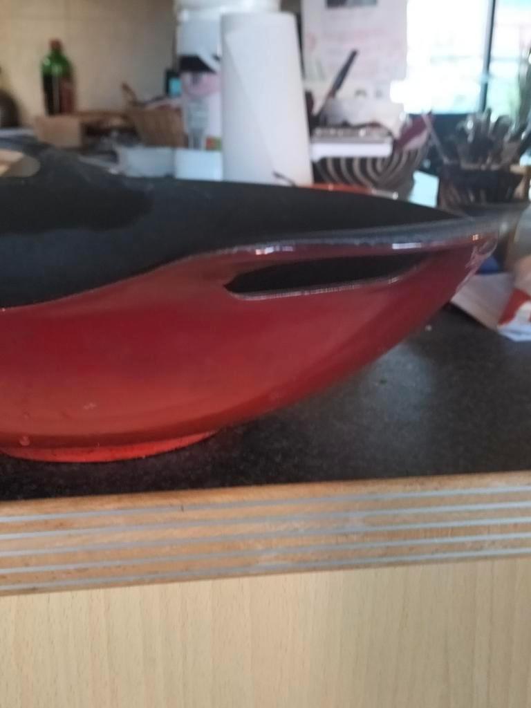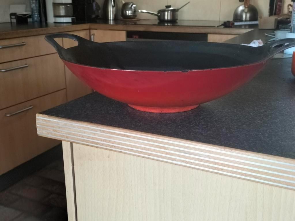 Wokpan, gietijzer zware pan, rood gietijze, geemailleerd diameter 35 cm. Werkt ook op inductie. Wordt hier niet gebruikt gratis v