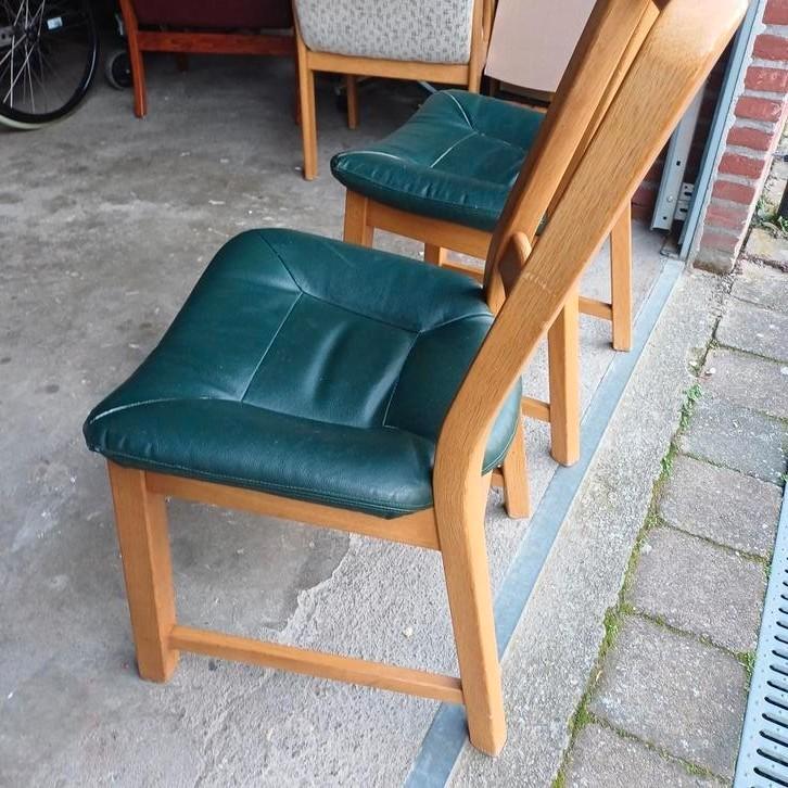 2 stevige houten stoelen met groen zitvlak. Gratis afhalen, worden niet verzonden.