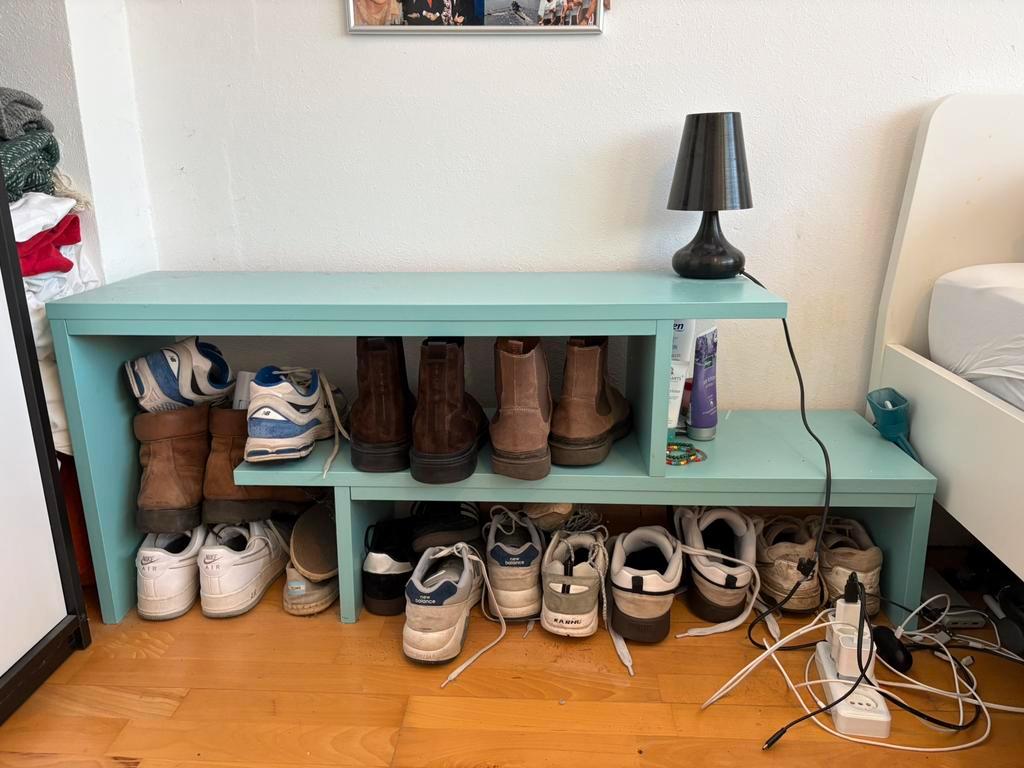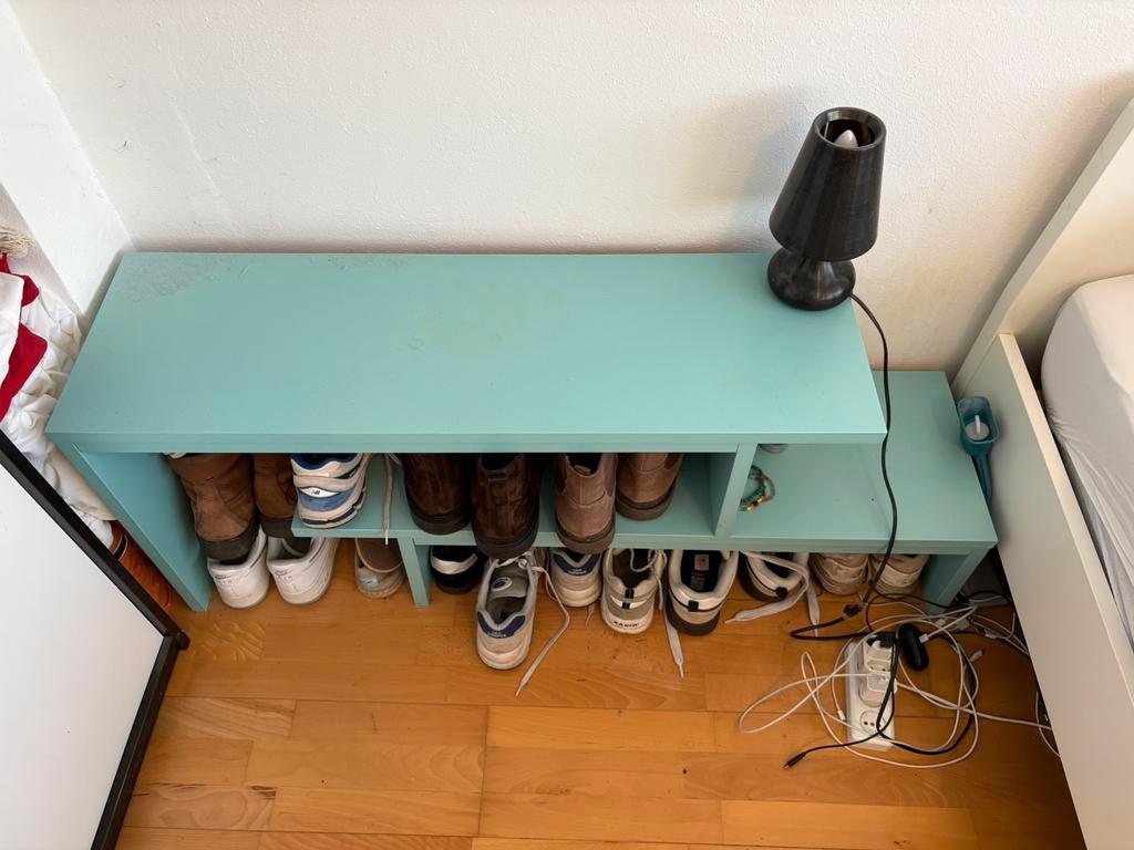 Zelf gemaakte nachtkastje. Gebruik ik ook als schoenenopberging zoals je kan zien. Bestaat uit twee gedeelten. Na de verhuizing ov