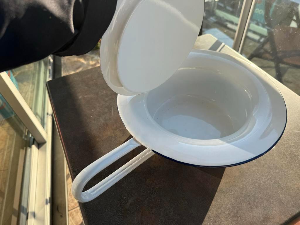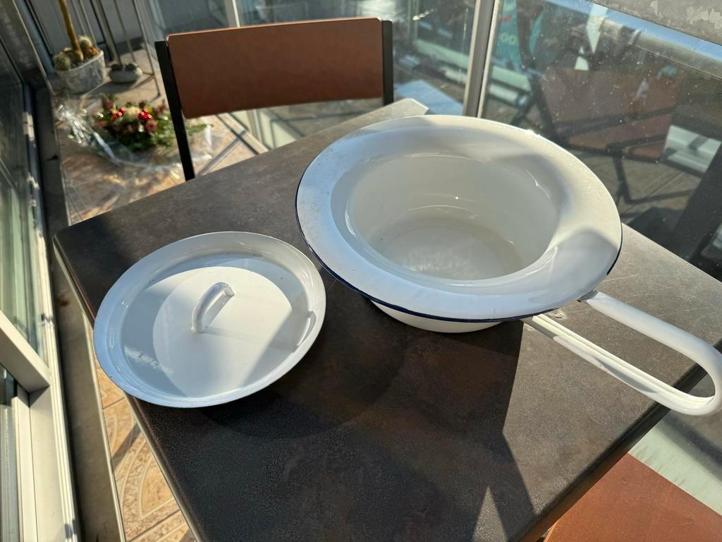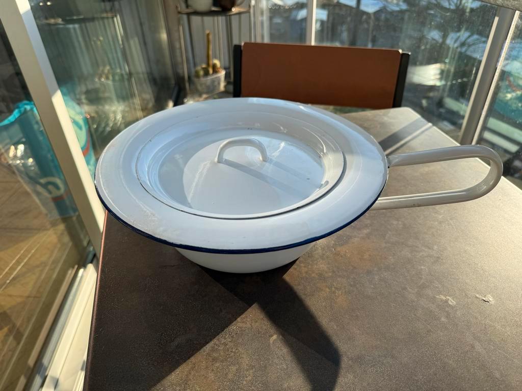 Oude emaille po met deksel. In goede staat, zie foto''s. Leuk als decoratie of voor verzamelaars.