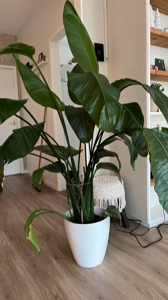 Grote groene plant met witte pot ongeveer 1,5 m hoog wegens ruimtegebrek