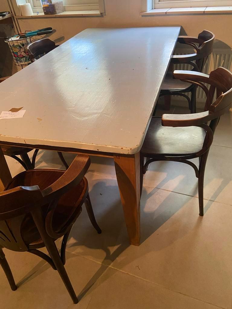 Massief houten tafel met een geschilderd tafelblad. De tafel en stoelen zijn in gebruikte staat en hebben een opknapbeurt nodig. I
