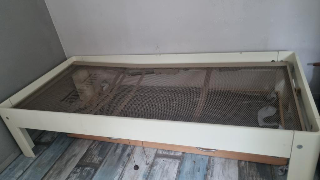 Comfortabel eenpersoonsbed, ideaal voor kleine ruimtes of logeerkamers. Afmetingen zijn standaard eenpersoons. 48Cm hoog. De bodem