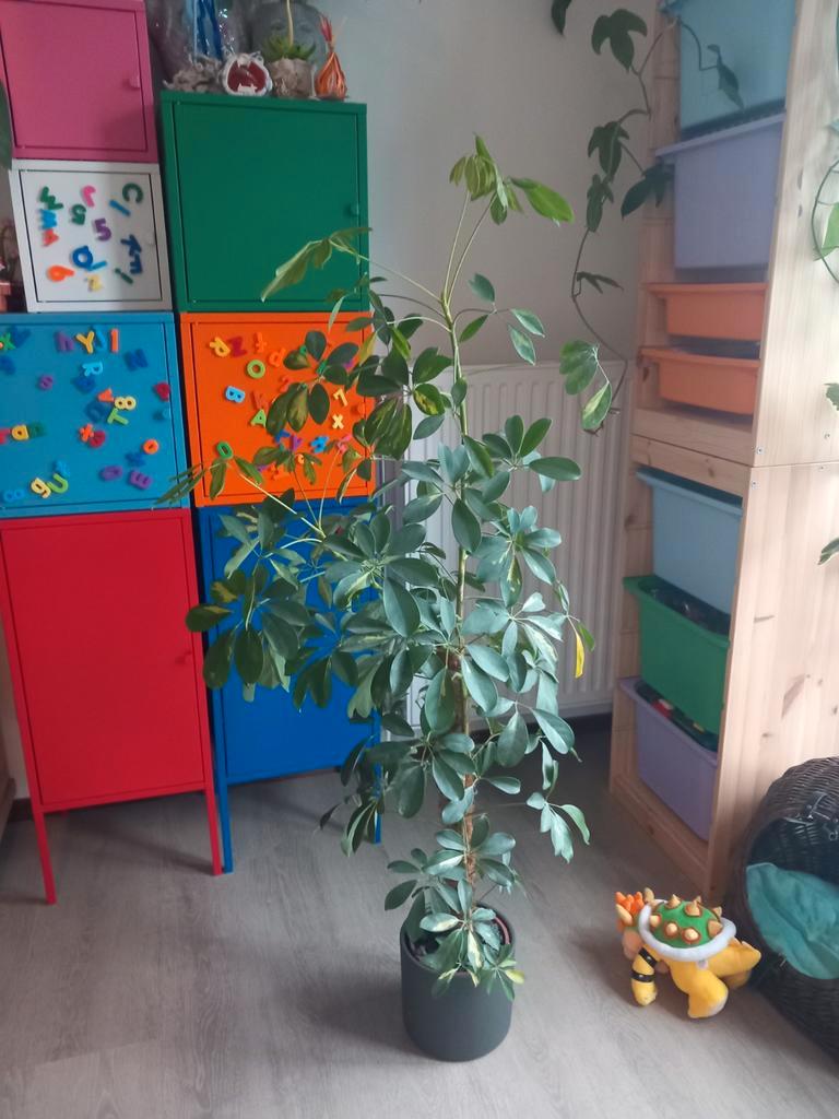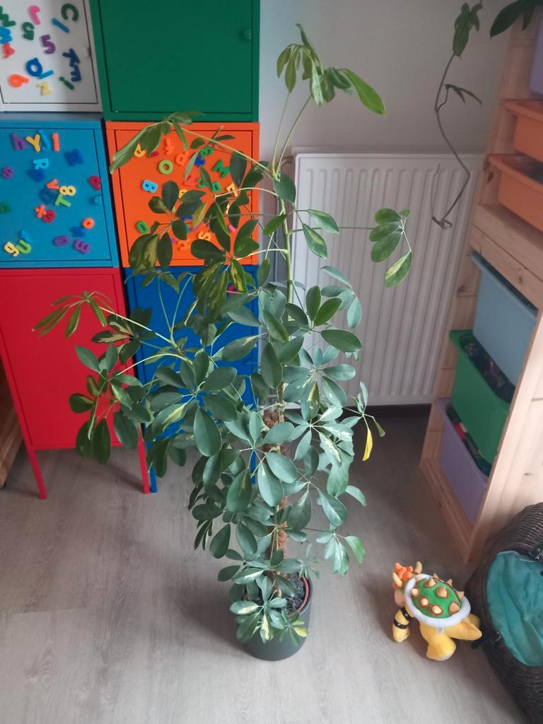 Schefflera gekleurd. Is ons te groot geworden. Heeft wat extra aandacht nodig. Stond hier de laatste weken iets te donker dus zit