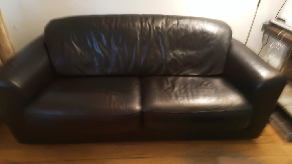 Gratis af te halen: een comfortabele leren bank en bijpassende fauteuil. Gebruikt, maar nog in goede staat. Bij zowel de bank als
