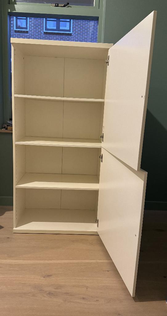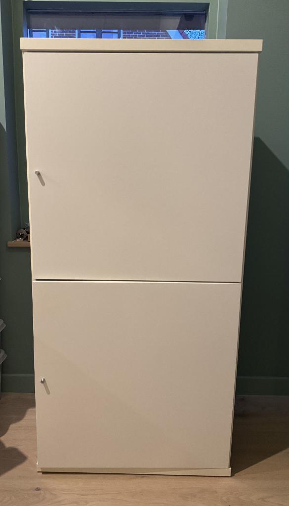 Witte bonde kast van ikea met deurtjes, ideaal voor extra opbergruimte. De kast is in gebruikte staat, maar nog prima te gebruiken