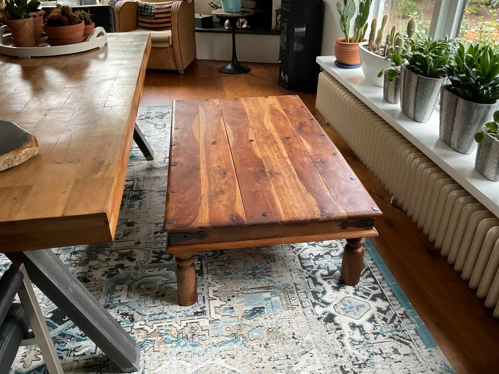 Stoere houten salontafel 140 breed 80 diep 40 hoog in goede staat voor de liefhebber gratis op te halen