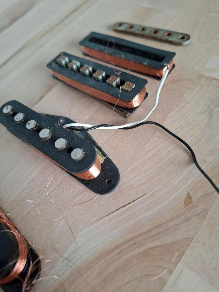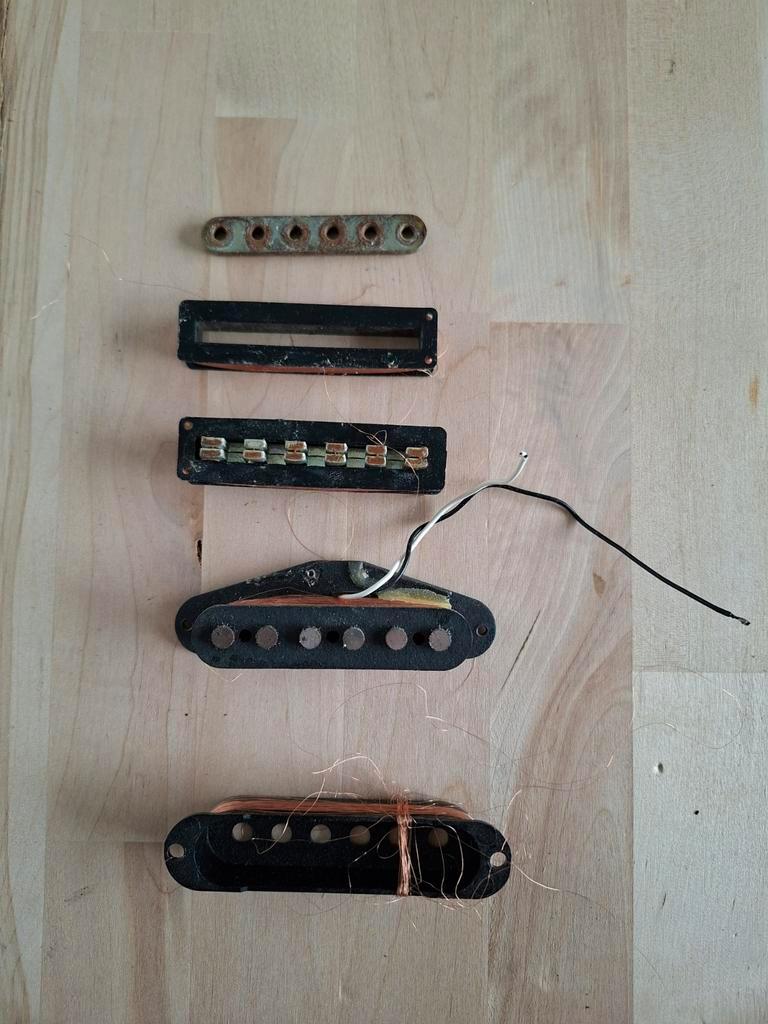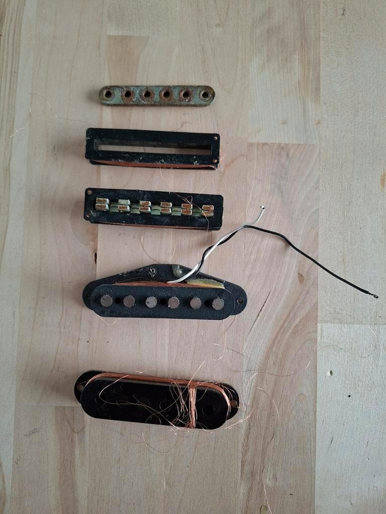 Voor de techneut en spoel-wikkelaar.drie defecte single coil pickups. 1X single coil kapje. De strat single coil komt van een japa