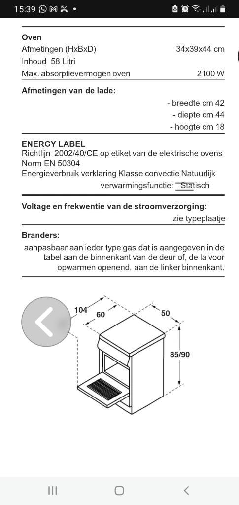Indesit fornuis k3g11(w)o gaspitten elektrische oven de afmetingen van het fornuis zijn: • hoogte: 85 cm • breedte: 50 cm • diepte