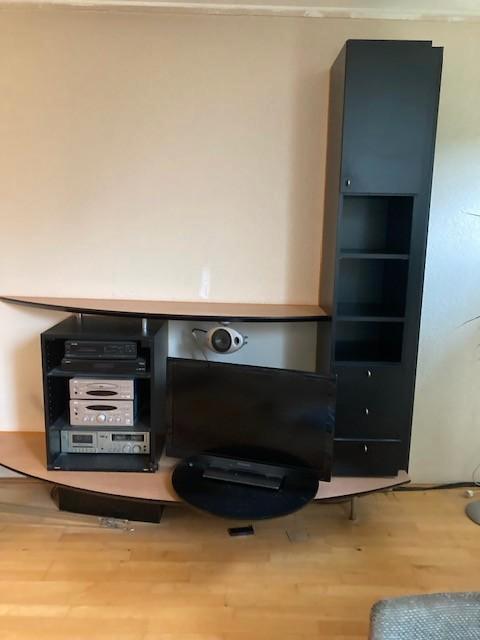 Tv kast met 3 ladenkast en meerdere bergruimte in hogere kast en ruimte voor apparatuur. Zijkant met verlichting.