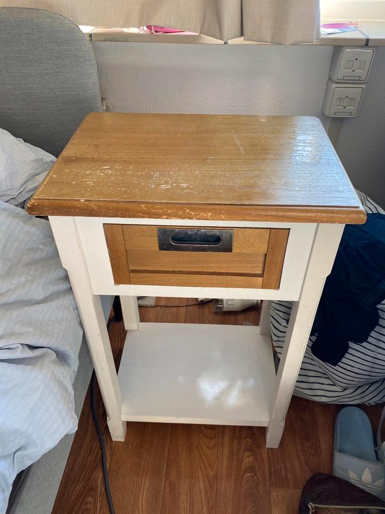 Leuk nachtkastje met een lade en een plank. Het kastje is gebruikt en heeft wat gebruikerssporen op het blad. Verder in goede staa