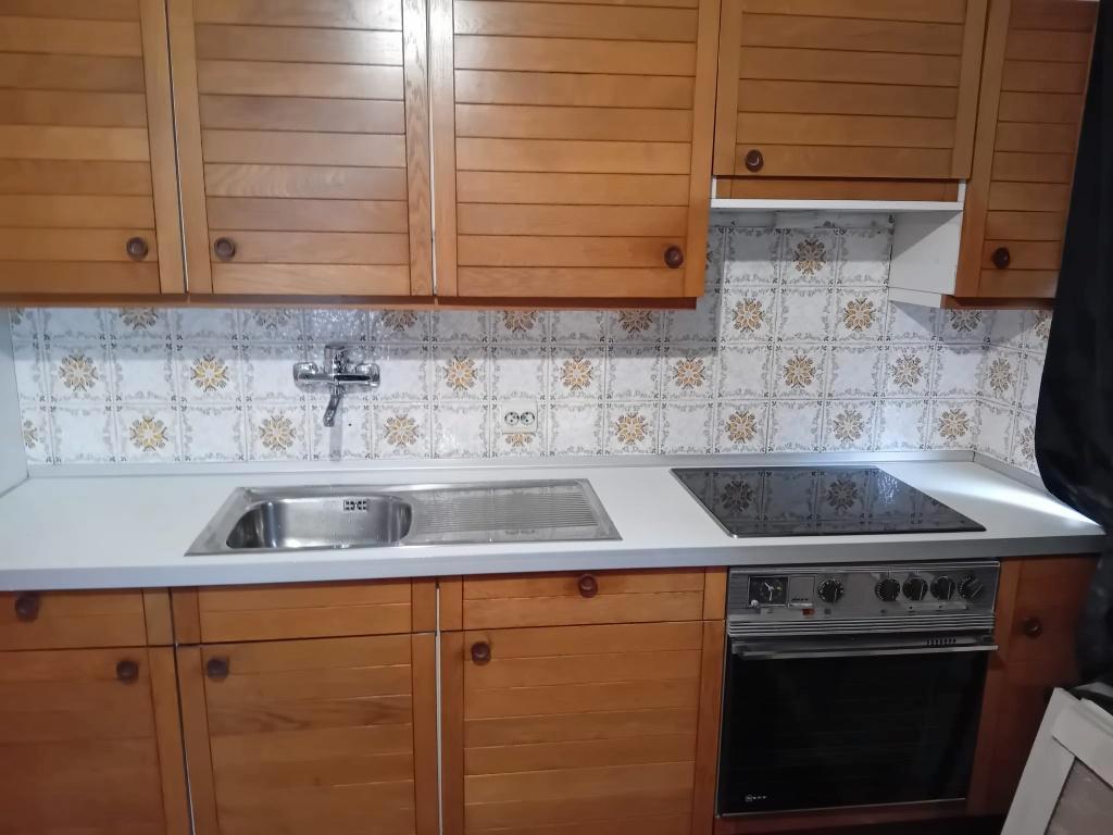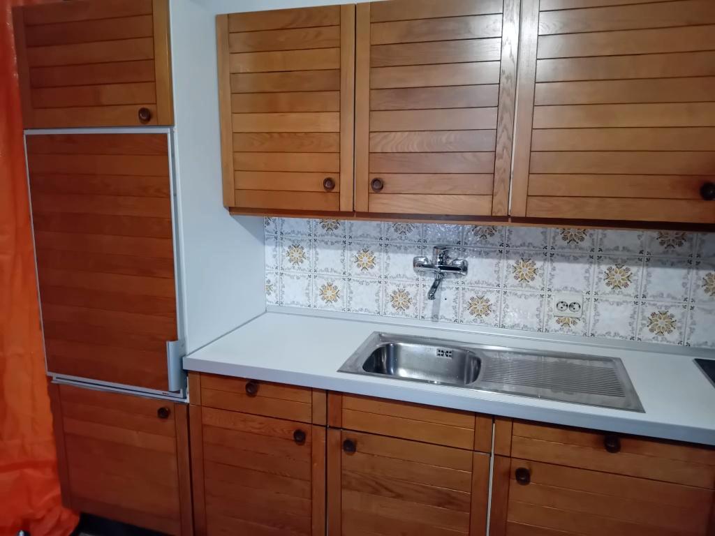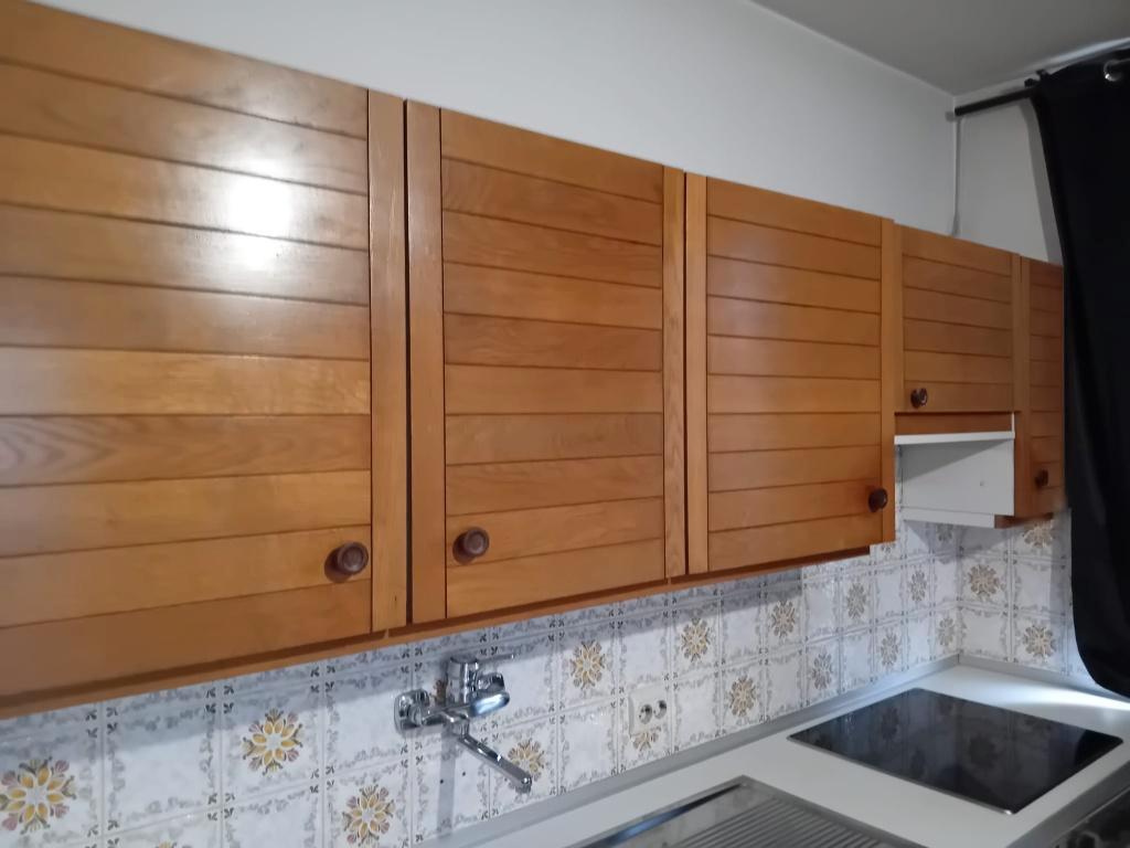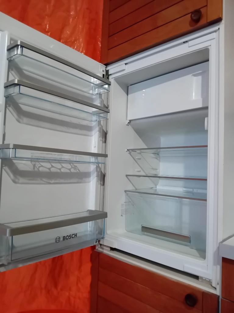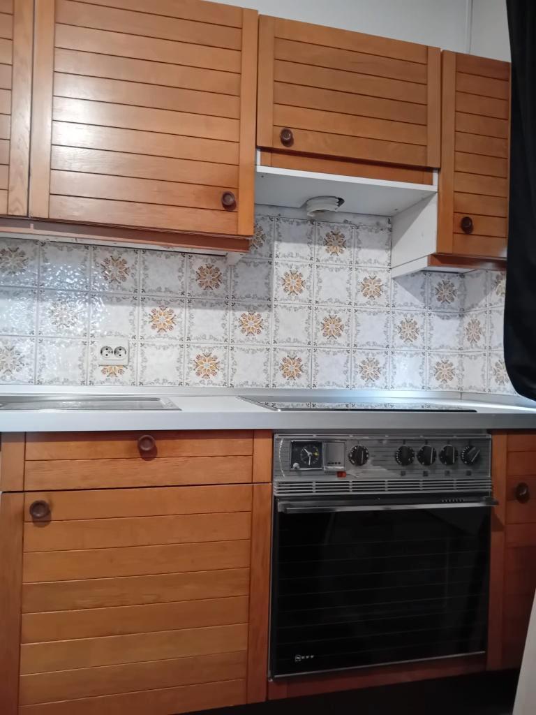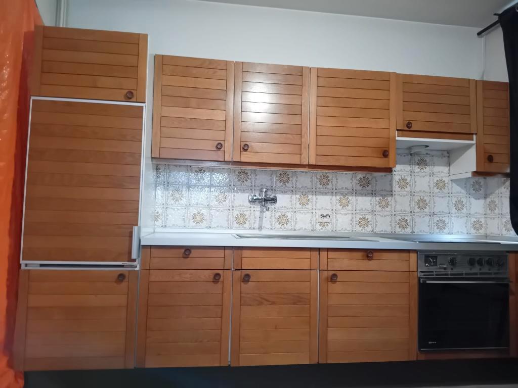 Vintage keuken jaren 70 met inbouwapparatuur ca. 310Cm breed. Houten frontjes. Koelkast, inductie kookplaat, electrische oven, rvs