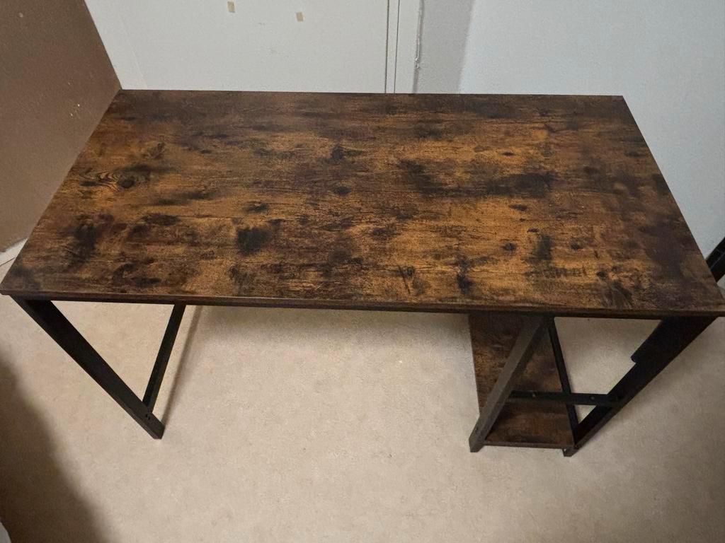 Een mooi bureau met een houten blad en een stevig metalen frame. Het bureau is in goede staat en perfect voor thuis of op kantoor.
