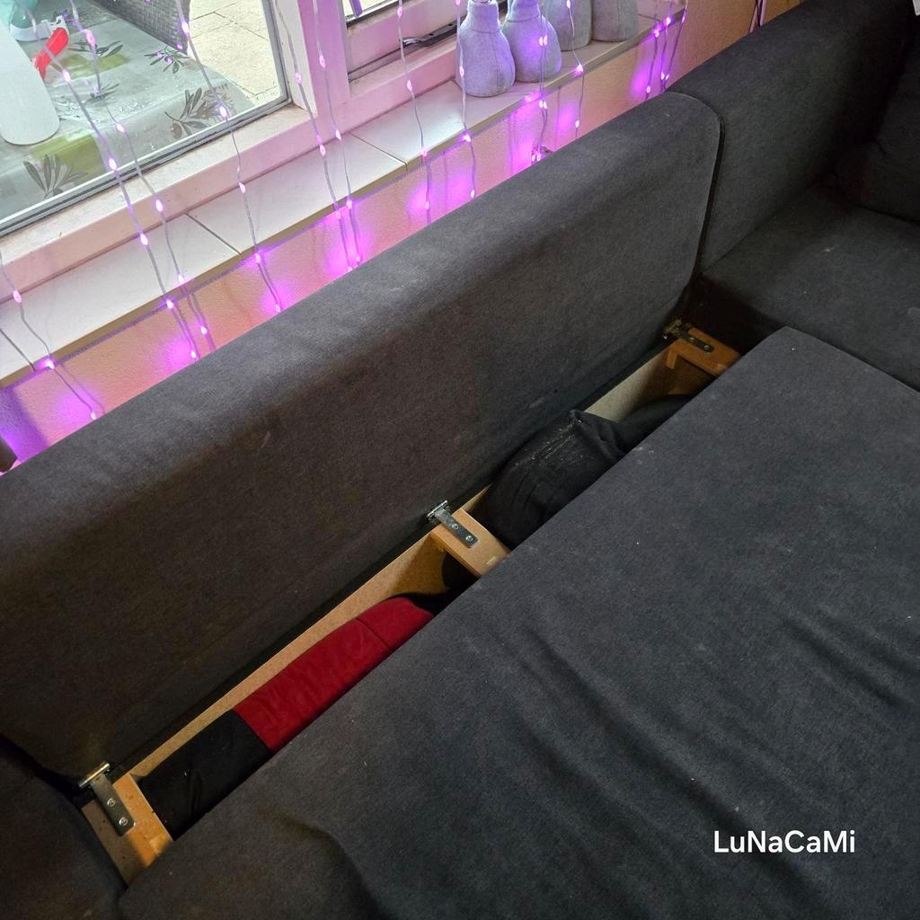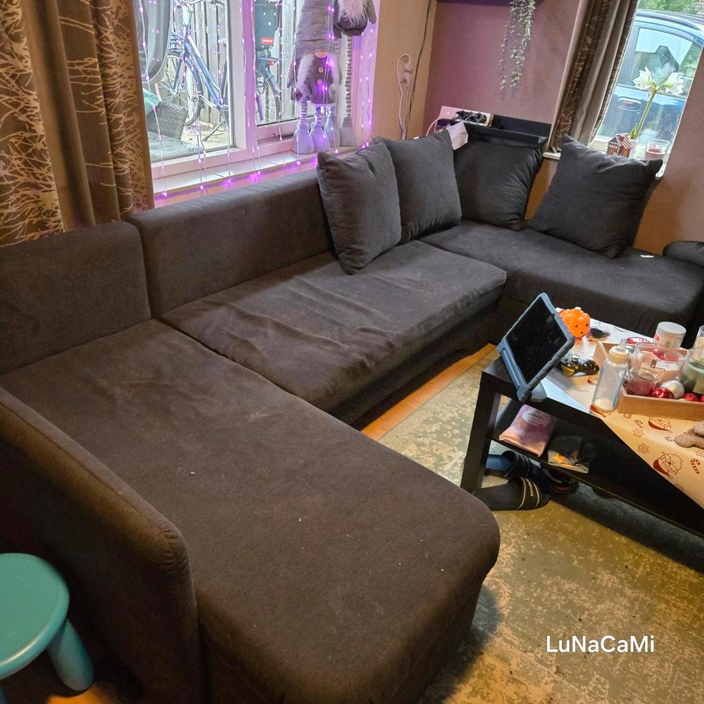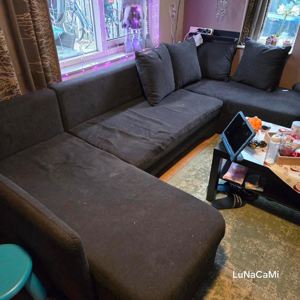 Ruime, comfortabele hoekbank met handige opbergruimte onder de zitting. De bank is in gebruikte staat, maar nog prima te gebruiken