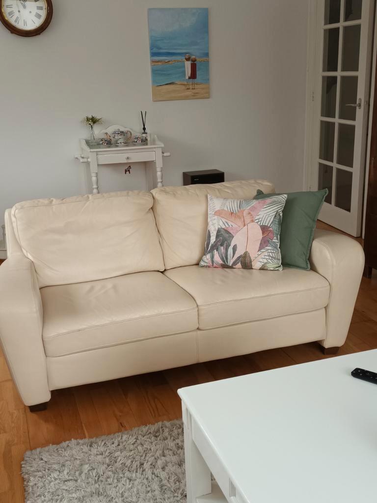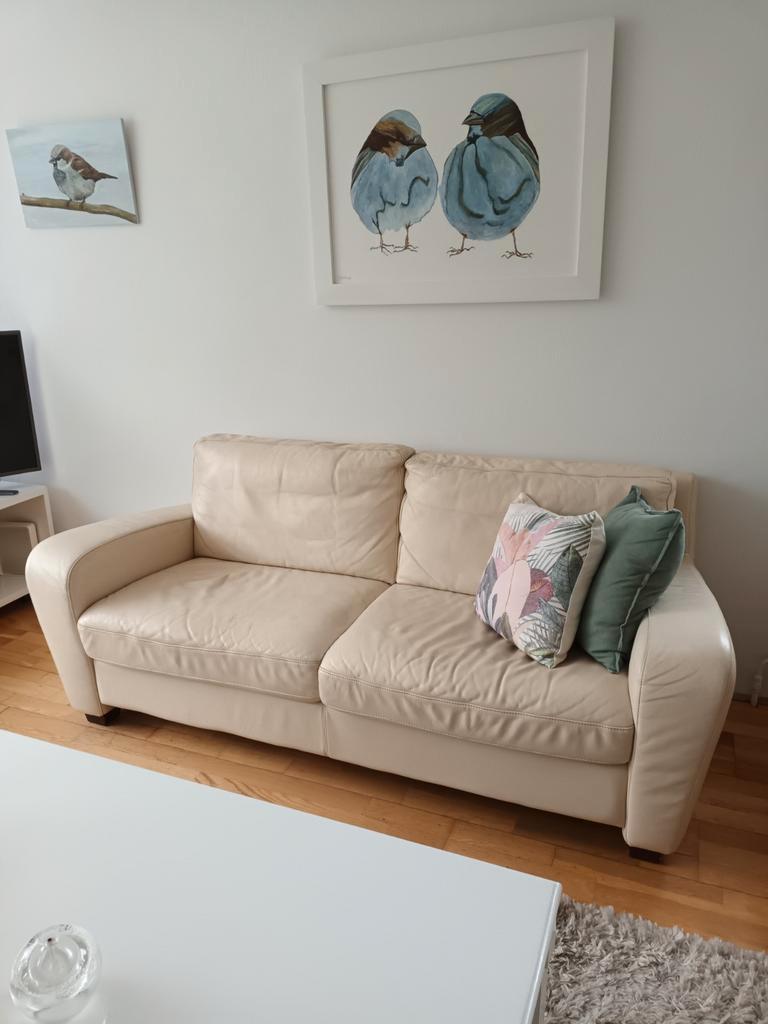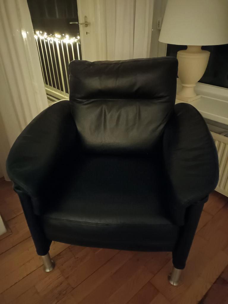 2 lichte leren banken (180 en 160 lang, 60 hoog). En een zwart leren design stoel. Op de grote bank wel wat gebruikerssporen. De k