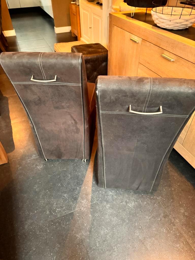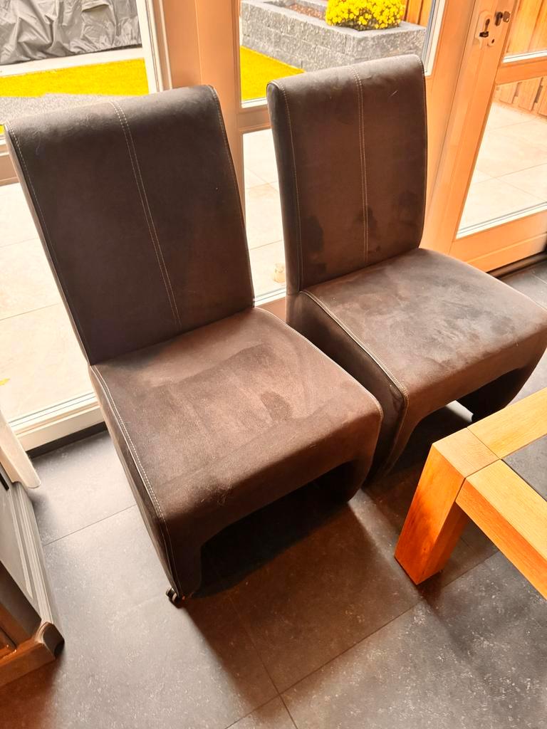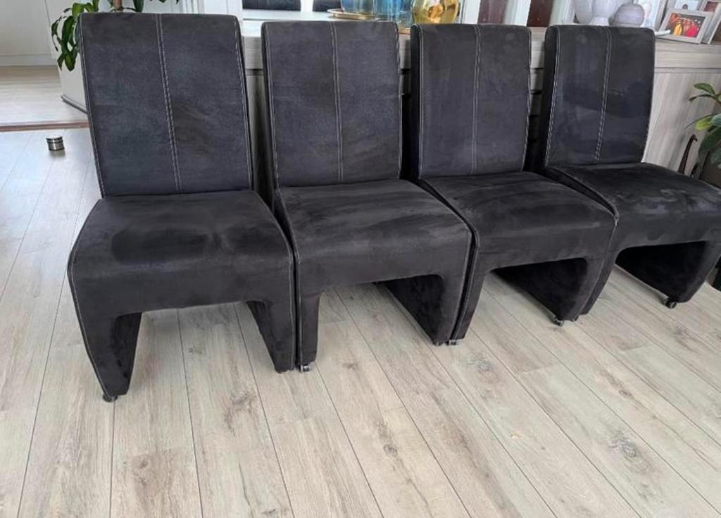 Vier bruine suede stoelen in nette staat. Ze zijn comfortabel en passen goed in een modern interieur. Ik bied ze aan voor een echt