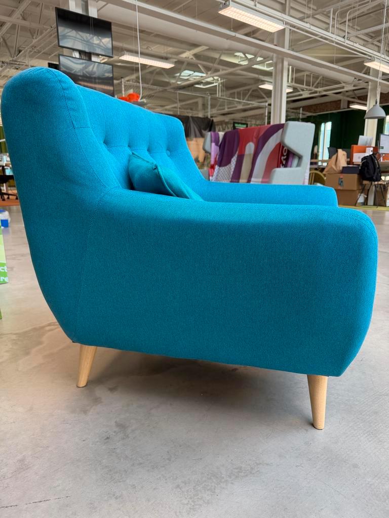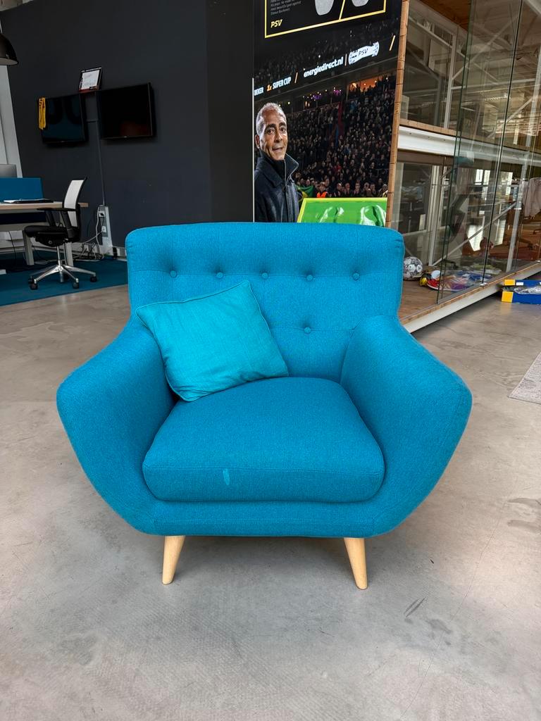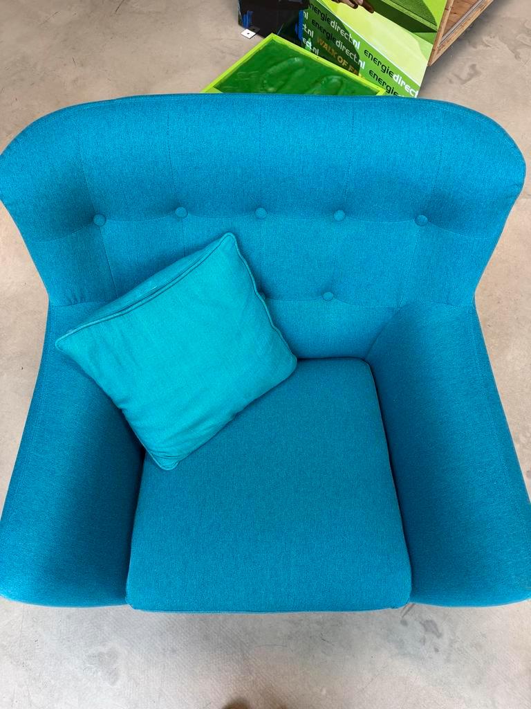 Comfortabele blauwe fauteuil met houten poten. Ideaal voor in de woonkamer of studeerkamer. De fauteuil is in goede staat en biedt