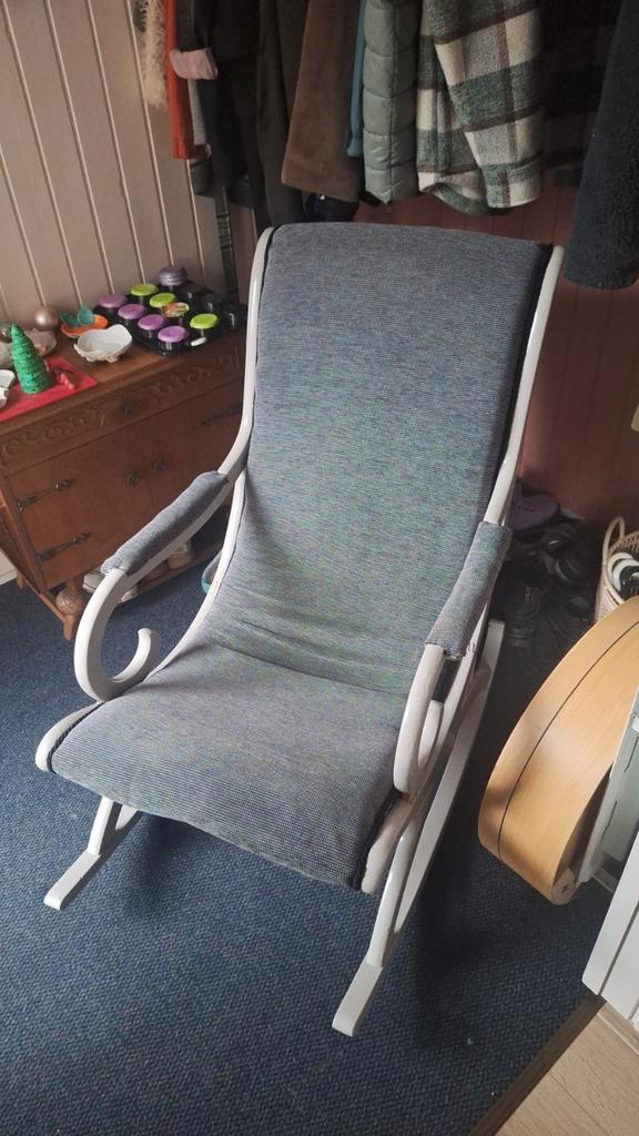 Een comfortabele schommelstoel met een grijze bekleding en een cremegrijs frame. De stoel is een opknapper omdat de bekleding lich