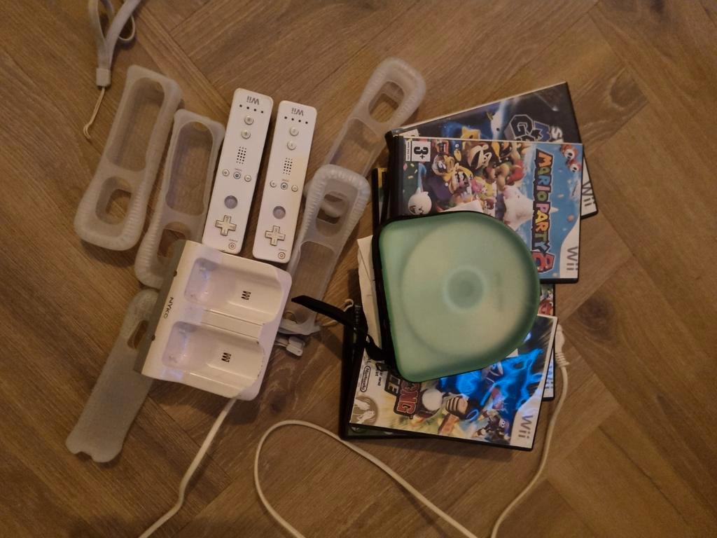 Let op! 2 Wii controllers met laadstation. Wij krijgen de controllers niet aan de praat en veel gebrande wii spellen, helaas leest