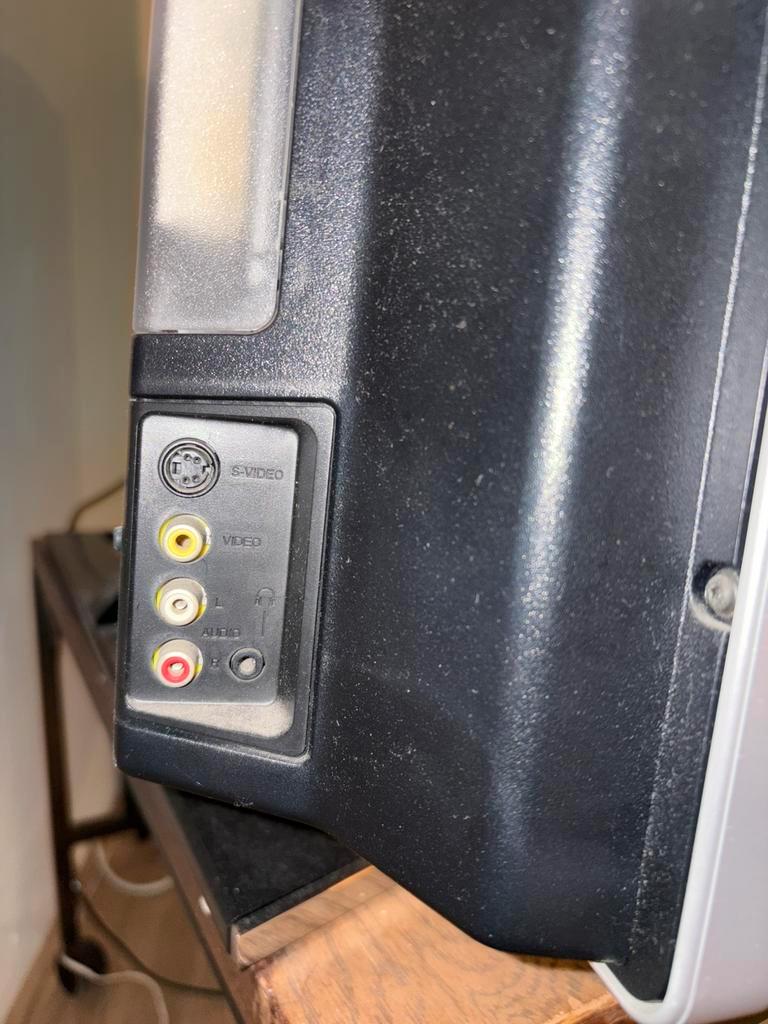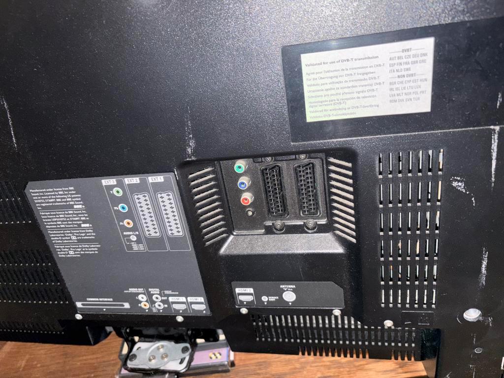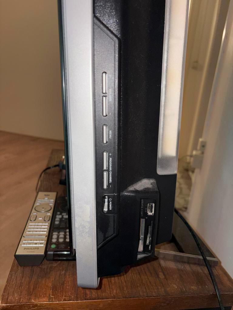 Tv van philips. Hij kantelt een beetje naar voren, wij hebben dat hier opgelost met een paar dvd’s.