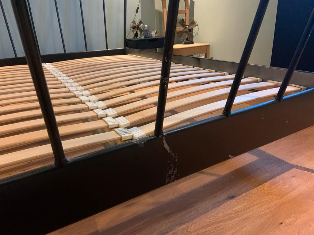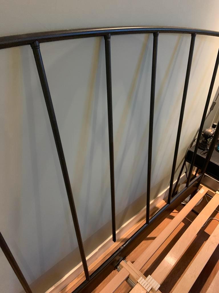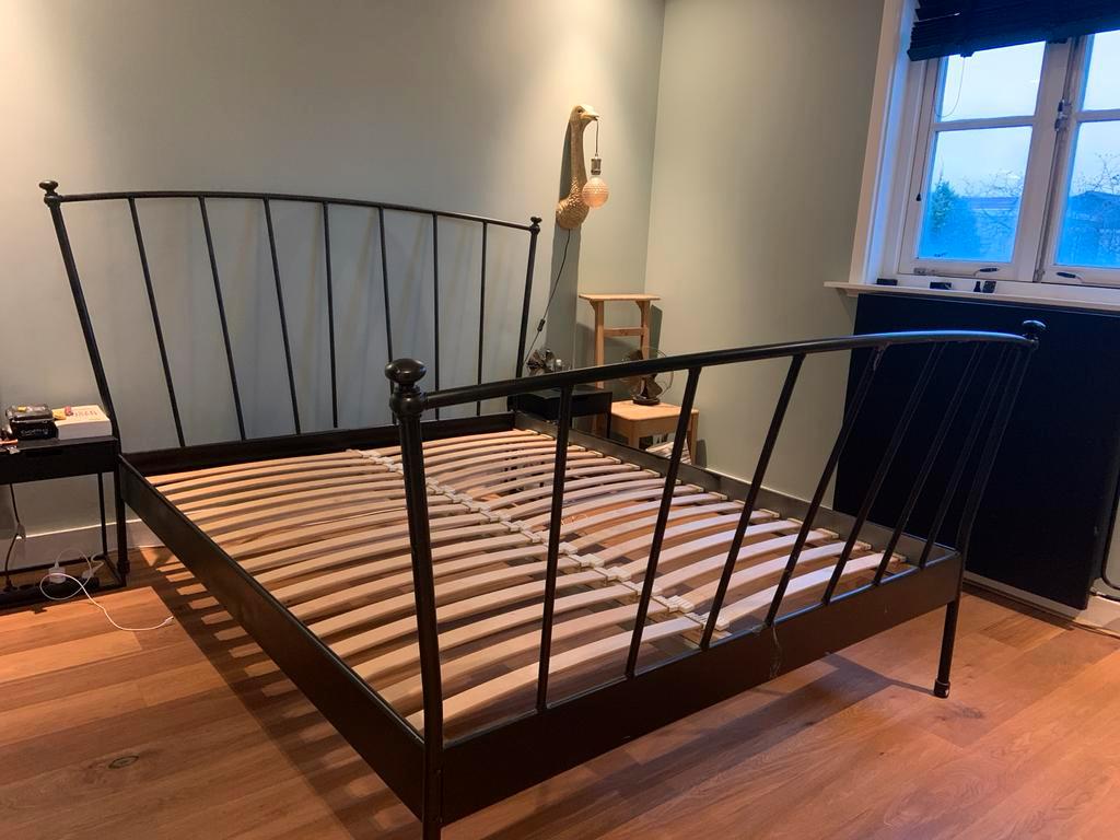 Tweepersoonsbed met lattenbodems (165x203 cm). Het bed is zwart gespoten metaal. Er is lakschade aan de voetzijde, dit kan opgelos