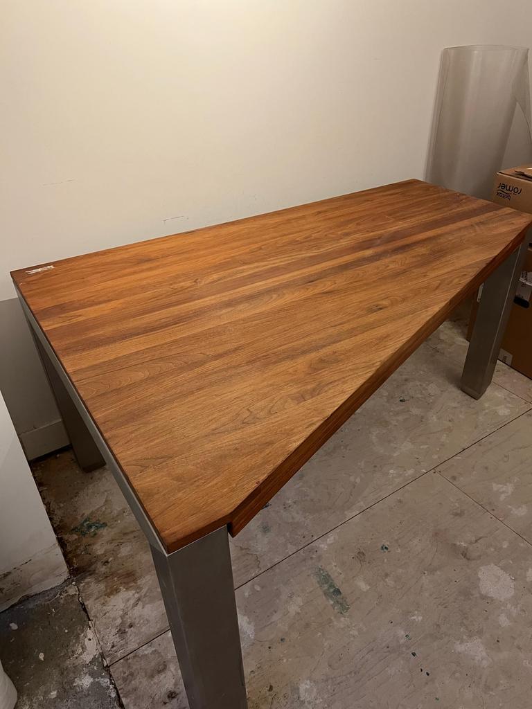 Stijlvol schuin bureau met een blad van massief eikenhout en een stevig stalen frame. Wegens gezinsuitbreiding moet dit bureau hel