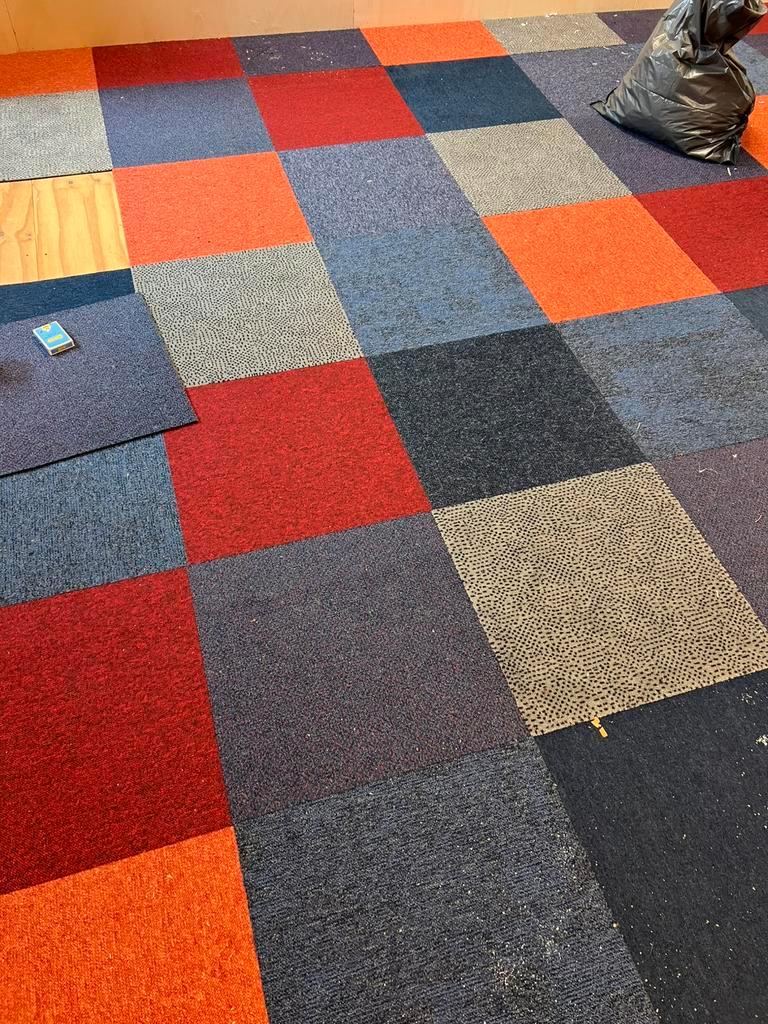 Vloertegels in de kleuren oranje en verschillende blauwtinten om een (werk)kamer sfeer te geven. Het heeft een ruimte can ca. 25M2