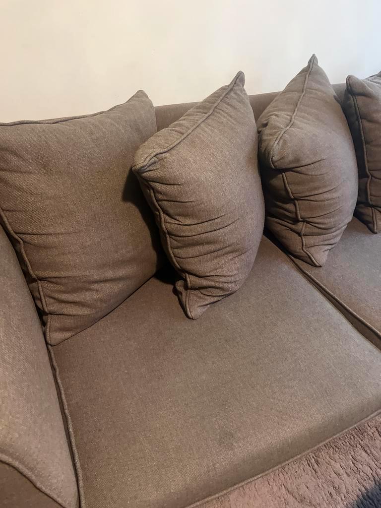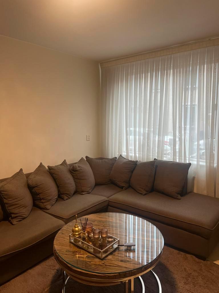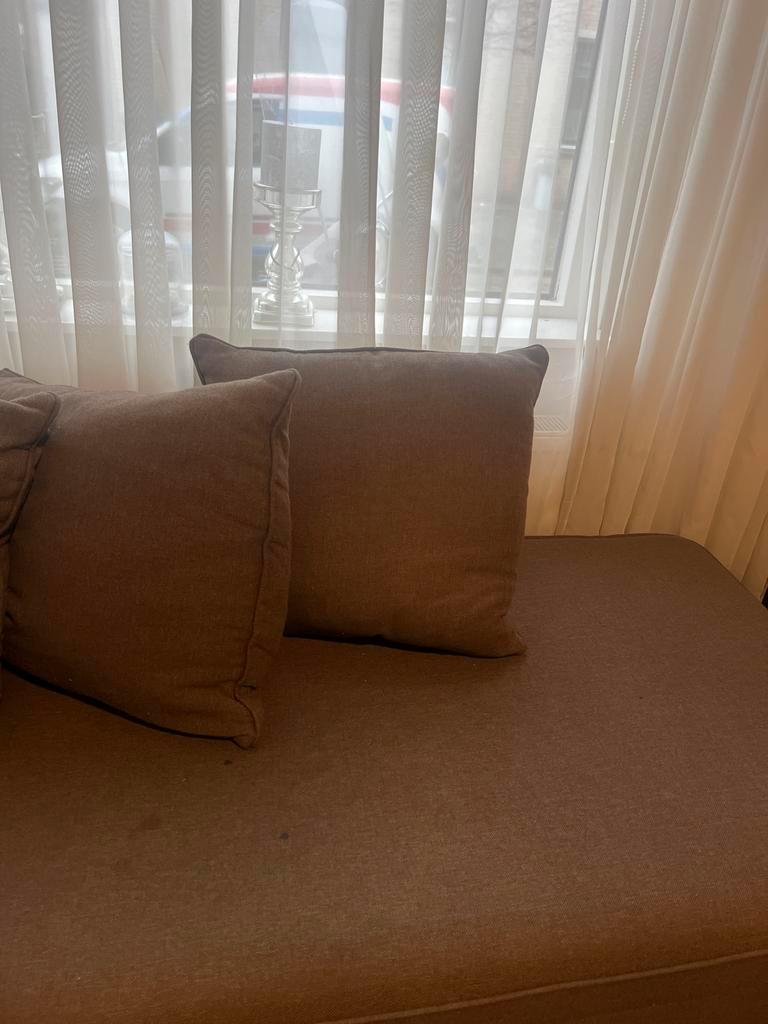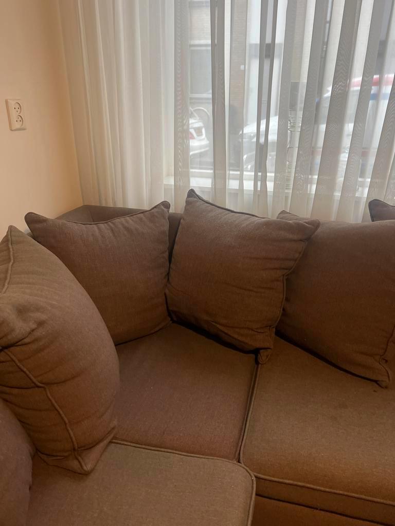 Comfortabele hoekbank met zachte kussens. Ideaal voor een gezellige woonkamer. Bank is goed gebruikt heeft paar vlekken
