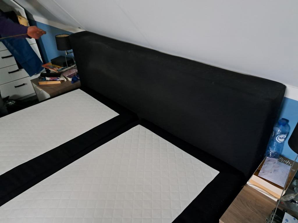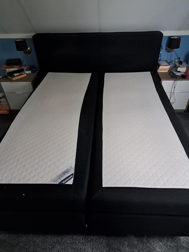 Zwarte boxspring van 160x200 cm. Bed is bijna 12 jaar, dus de matrassen zijn aan vervanging toe, maar er heeft altijd een topper o