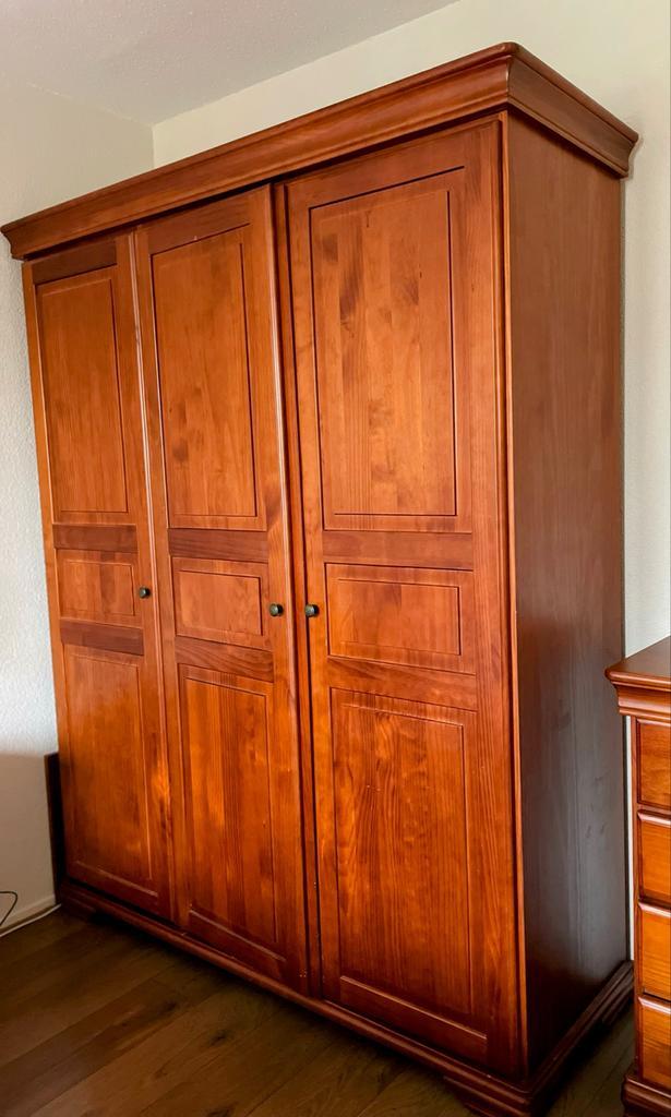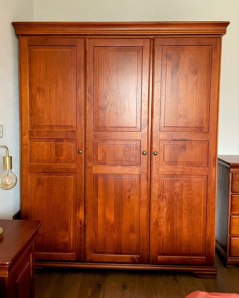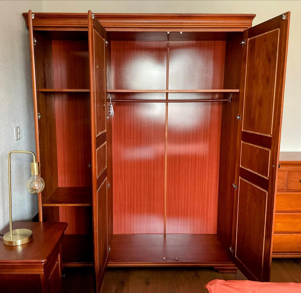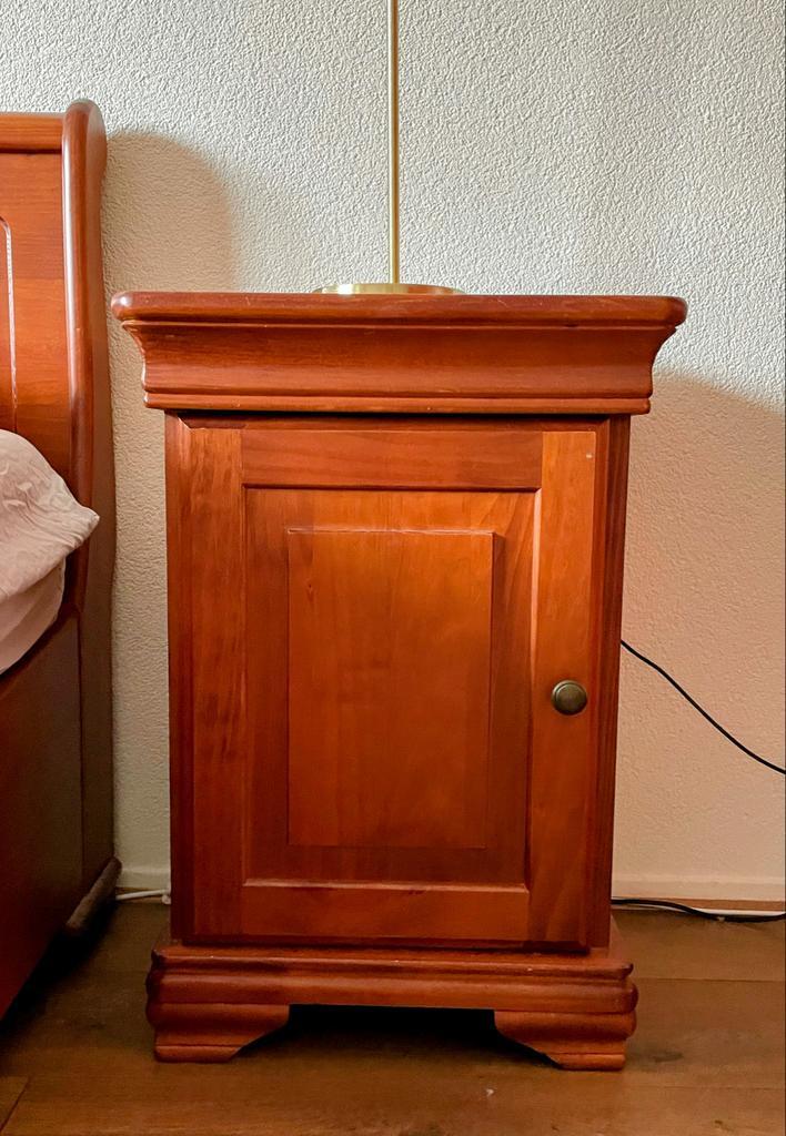 Complete slaapkamer set van massief hout, in goede staat. Wordt alleen als geheel aangeboden – niet los. Set bestaat uit: – tweepe