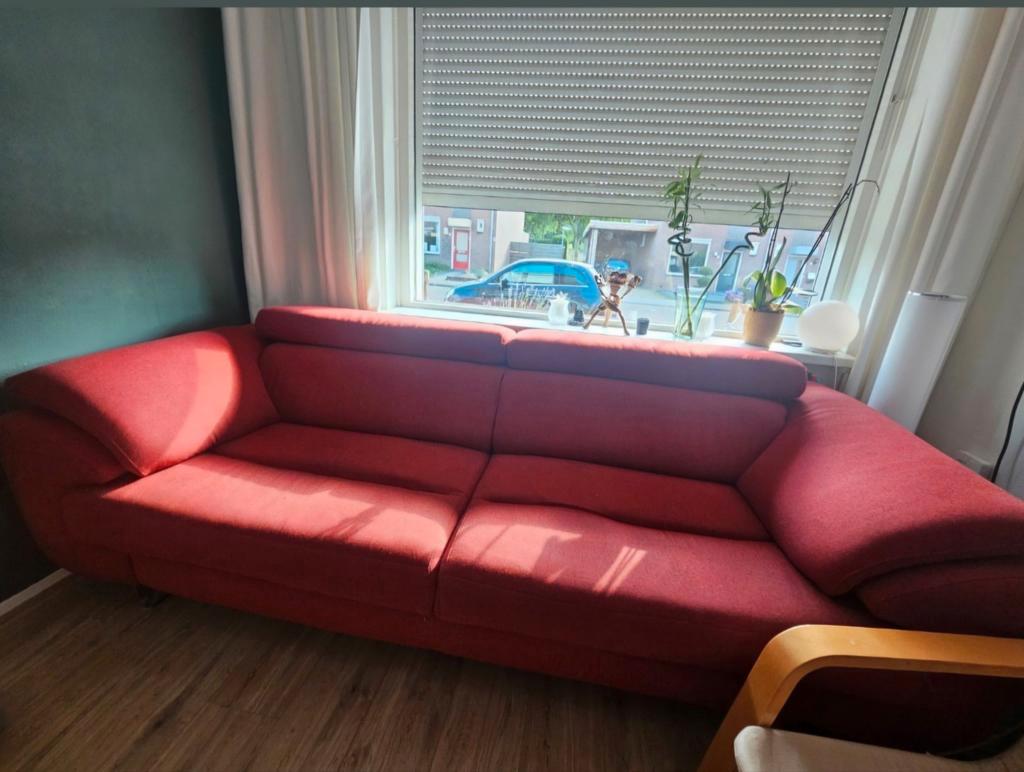 Mooie, comfortabele rode stoffen bank. Geschikt voor 3 personen. De bank is in gebruikte, maar goede staat. De afmetingen zijn ong