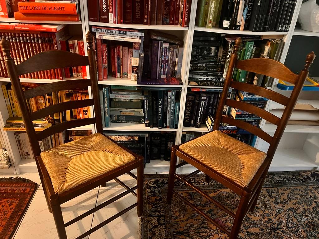 Twee houten stoelen met een zitting van riet. De stoelen zijn gratis af te halen. Ideaal voor in de keuken, eetkamer of als extra